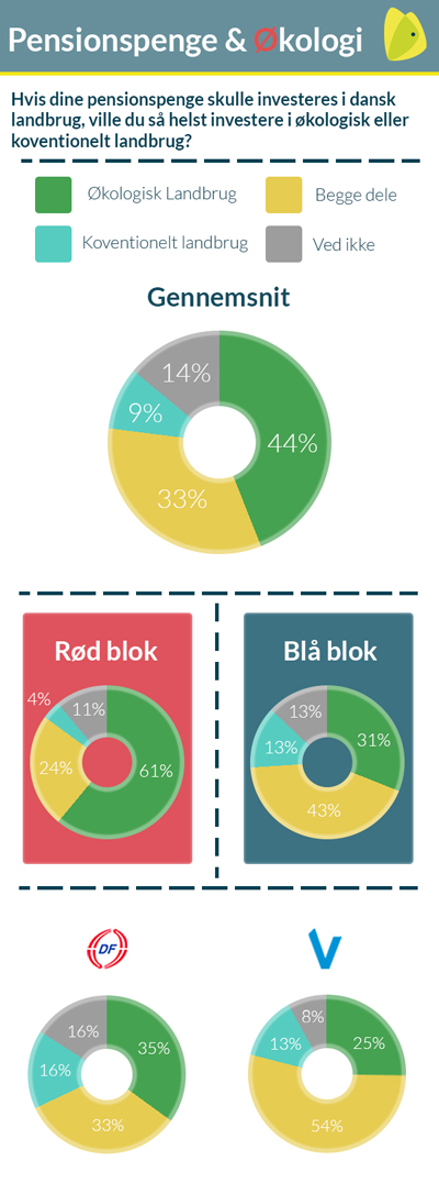 For eksempel ønsker 25 procent af regeringspartiet Venstres egne vælgere, at hvis der skal investeres pensionspenge i dansk landbrug, så skal det være i økologi. Blot 13 procent af Venstres vælgere vil sætte pengene i konventionelt. Venstre-regeringen står bag landbrugspakken, som med et milliardbeløb tilgodeser det konventionelle landbrug på bekostning af natur, miljø og økologi.